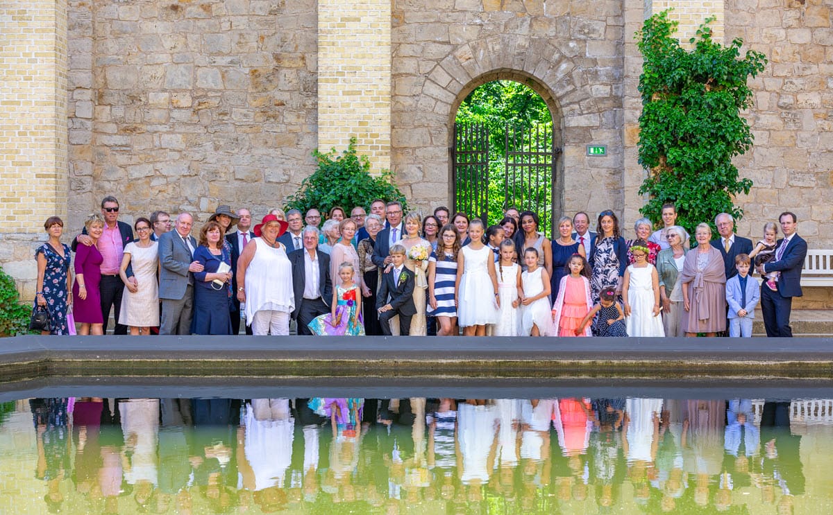 Nach der ausgelassenen Feier war die Festgesellschaft beinahe zu einer kleinen großen Familie gewachsen, die wir gemeinsam in einem großen Bild festhalten konnten, das heute nicht nur dem Brautpaar Freude macht.